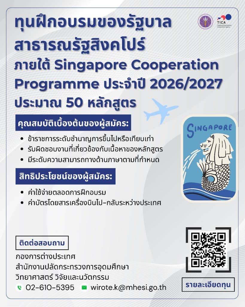 ขอประชาสัมพันธ์และเชิญชวนสมัครเข้าร่วมหลักสูตรฝึกอบรมภายใต้ Singapore Cooperation Programme (SCP)