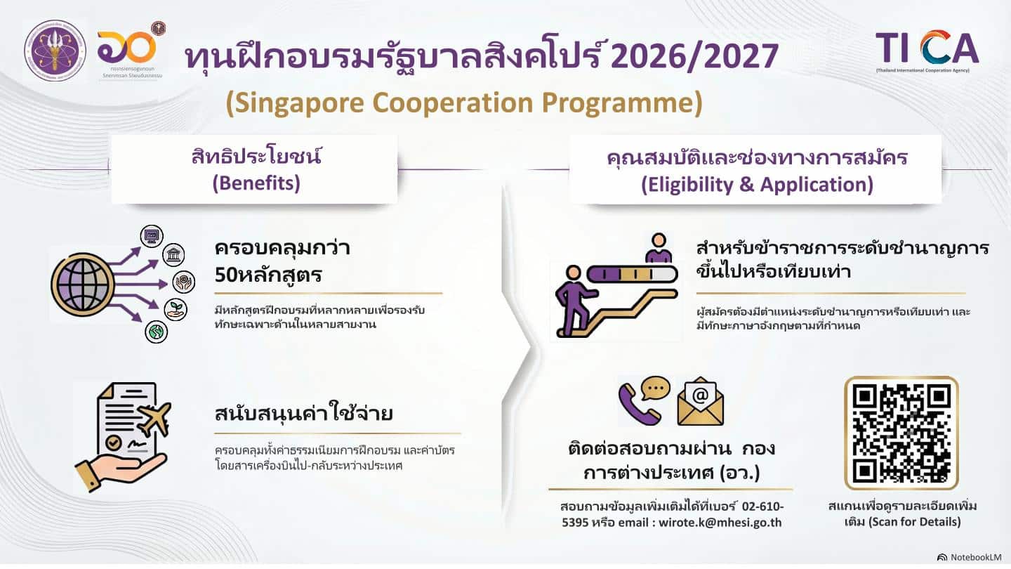 ขอประชาสัมพันธ์และเชิญชวนสมัครเข้าร่วมหลักสูตรฝึกอบรมภายใต้ Singapore Cooperation Programme (SCP)