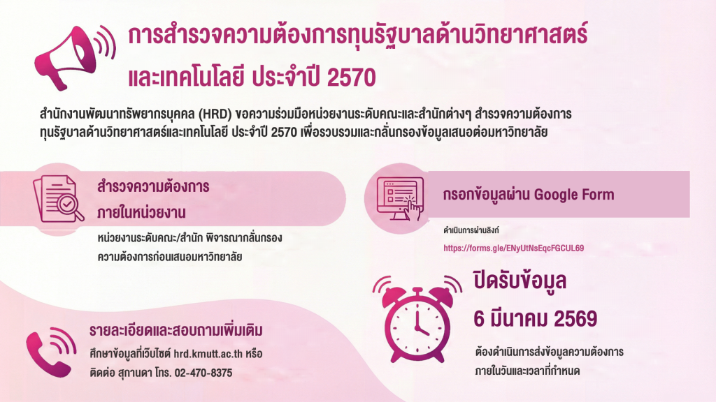 ข่าวประชาสัมพันธ์การสำรวจความต้องการทุนรัฐบาลด้านวิทยาศาสตร์และเทคโนโลยี ประจำปี 2570 Admin / 25 February 2026 สำรวจความต้องการทุนรัฐบาลด้านวิทยาศาสตร์และเทคโนโลยี ประจำปี 2570 เอกสารเพิ่มเติม << Download >> สอบถามข้อมูลเพิ่มเติมได้ที่ สุกานดา โทร. 0-2470-8375