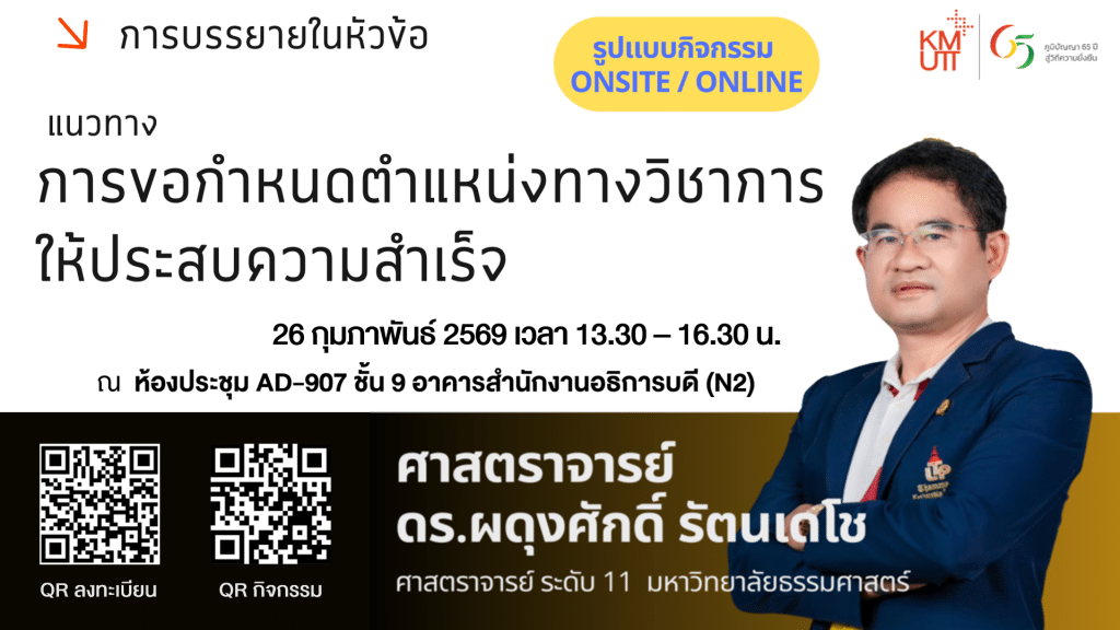 ข่าวประชาสัมพันธ์ประชาสัมพันธ์กิจกรรมบรรยาย แนวทางการขอกำหนดตำแหน่งทางวิชาการให้ประสบความสำเร็จ Admin / 19 February 2026 แนวทางการขอกำหนดตำแหน่งทางวิชาการให้ประสบความสำเร็จ วิทยากร ศ. ดร.ผดุงศักดิ์ รัตนเดโช วันที่ 26 กุมภาพันธ์ 2569 เวลา 13:30 - 16:30 น. ห้องประชุม AD-907 ชั้น 9 อาคารสำนักงานอธิการบดี (N2)
